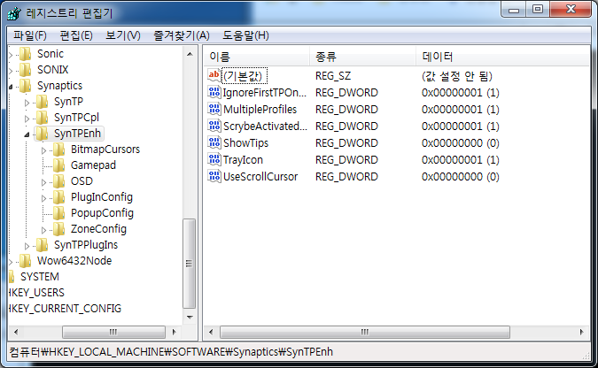 HKEY_LOCAL_MACHINE\SOFTWARE\Synaptics\SynTPEnh 밑에