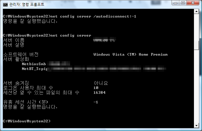 명령 프롬프트에 net config server /autodisconnect:-1 라고 입력 실행한다.