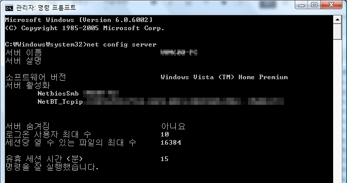 명령 프롬프트에 net config server 를 입력 실행한다.