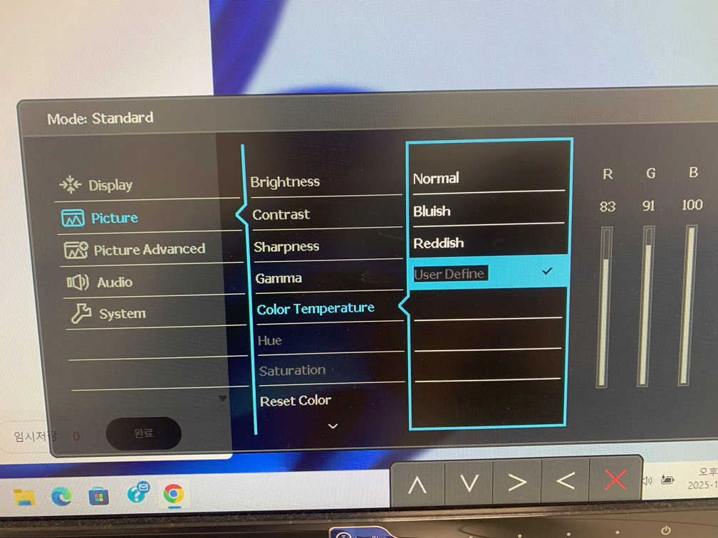 기본적으로 모니터 설정에 보면 색온도를 수정할 수 있다. 빨강, 초록, 파랑 (RGB)를 수정할 수 있는데 보통 각 100으로 돼있거든. 여기서 빨간 색과 초록색을 좀 낮춰주면 일단 하얀색~검정색이 더이상 분홍처럼 보이지 않고 다른 색들도 좀 더 명확한 색감을 보여준다. 어떤 사람은 RGB를 80:80:100으로 하는 경우도 있다. 나는 위에 83:91:100이 제일 맞는 거 같다.